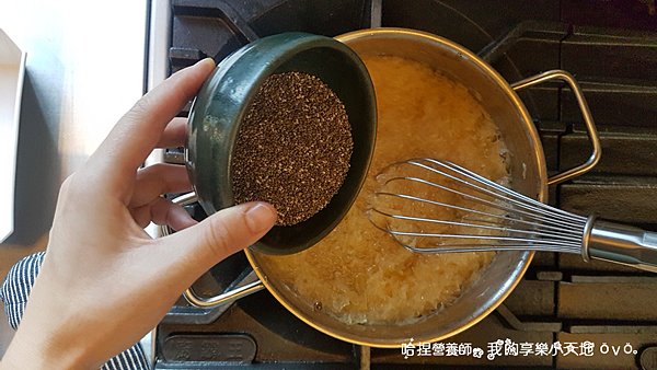 5. 加入奇亞籽一起煮,此時可加入百里香、檸檬汁(或君度橙酒)。