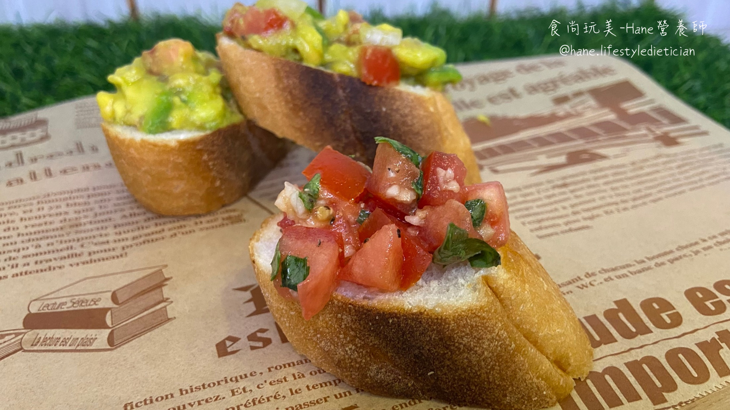 做法:番茄切丁、九層塔切碎、蒜頭切末,將所有材料混合均勻,塗抹在烤麵包上即可